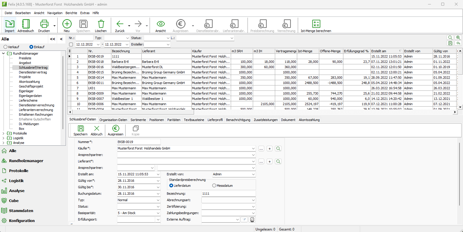 Felix/Materialbuch enthält neben den Funktionen der Felix-Basic-Version eine Vielzahl an Analyse- und Auswertungsmöglichkeiten. Sie können damit Ihre gesamten Holzlieferungen mit wenigen Klicks analysieren. Das System liefert Ihnen detaillierte Informationen zu den Einzelmengen, der Sortimentsverteilung, den Ausformungsfehlern uvm. Sie können sich die Ergebnisse als Tabellen oder als Diagramme darstellen lassen. Auch die Erstellung und Überprüfung der Abrechnungen kann mit wenigen Mausklicks durchgeführt werden. Besonderheit ist der Rundholzmanager mit der Verwaltung von Schlussbriefen und Dienstleisterverträgen, Projekten und Erfassung der Lieferscheine. Übernahme von XML-Logistiklieferscheinen ist ebenfalls enthalten.