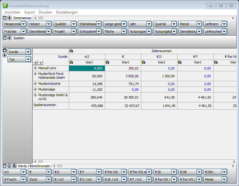 Felix/Materialbuch enthält neben den Funktionen der Felix-Basic-Version eine Vielzahl an Analyse- und Auswertungsmöglichkeiten. Sie können damit Ihre gesamten Holzlieferungen mit wenigen Klicks analysieren. Das System liefert Ihnen detaillierte Informationen zu den Einzelmengen, der Sortimentsverteilung, den Ausformungsfehlern uvm. Sie können sich die Ergebnisse als Tabellen oder als Diagramme darstellen lassen. Auch die Erstellung und Überprüfung der Abrechnungen kann mit wenigen Mausklicks durchgeführt werden. Besonderheit ist der Rundholzmanager mit der Verwaltung von Schlussbriefen und Dienstleisterverträgen, Projekten und Erfassung der Lieferscheine. Übernahme von XML-Logistiklieferscheinen ist ebenfalls enthalten.
